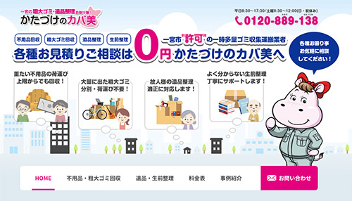 かたづけのカバ美は、愛知県一宮市で昭和46年から事業を展開している尾張テクアス株式会社による不用品回収サービスです。不用品回収、粗大ごみ回収、遺品整理、生前整理に対応しています。