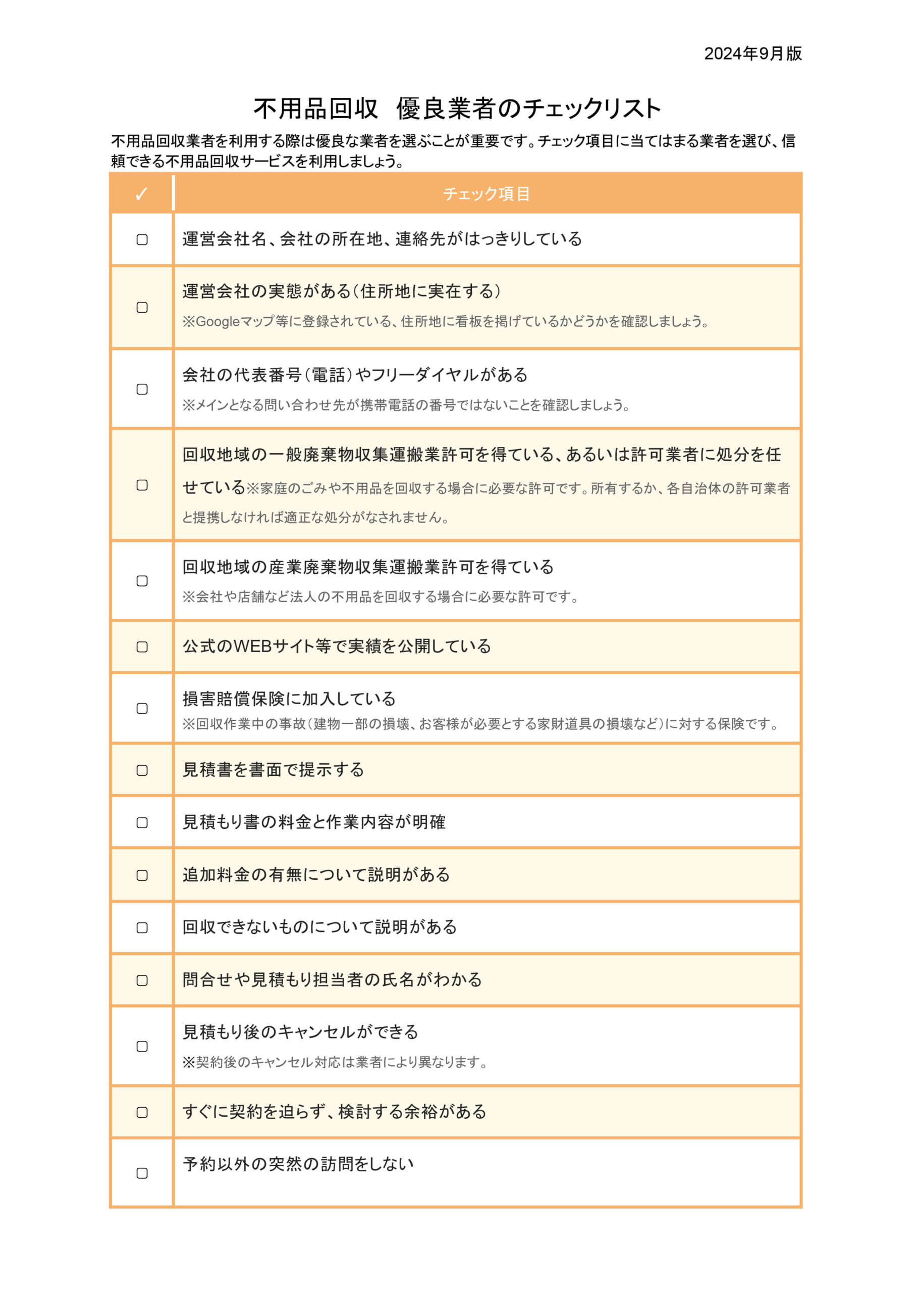 業者選びの参考に、「優良な不用品回収業者を見分けるチェックリスト」を公開しています。クリックすると拡大し、印刷もできます。ぜひご利用ください。