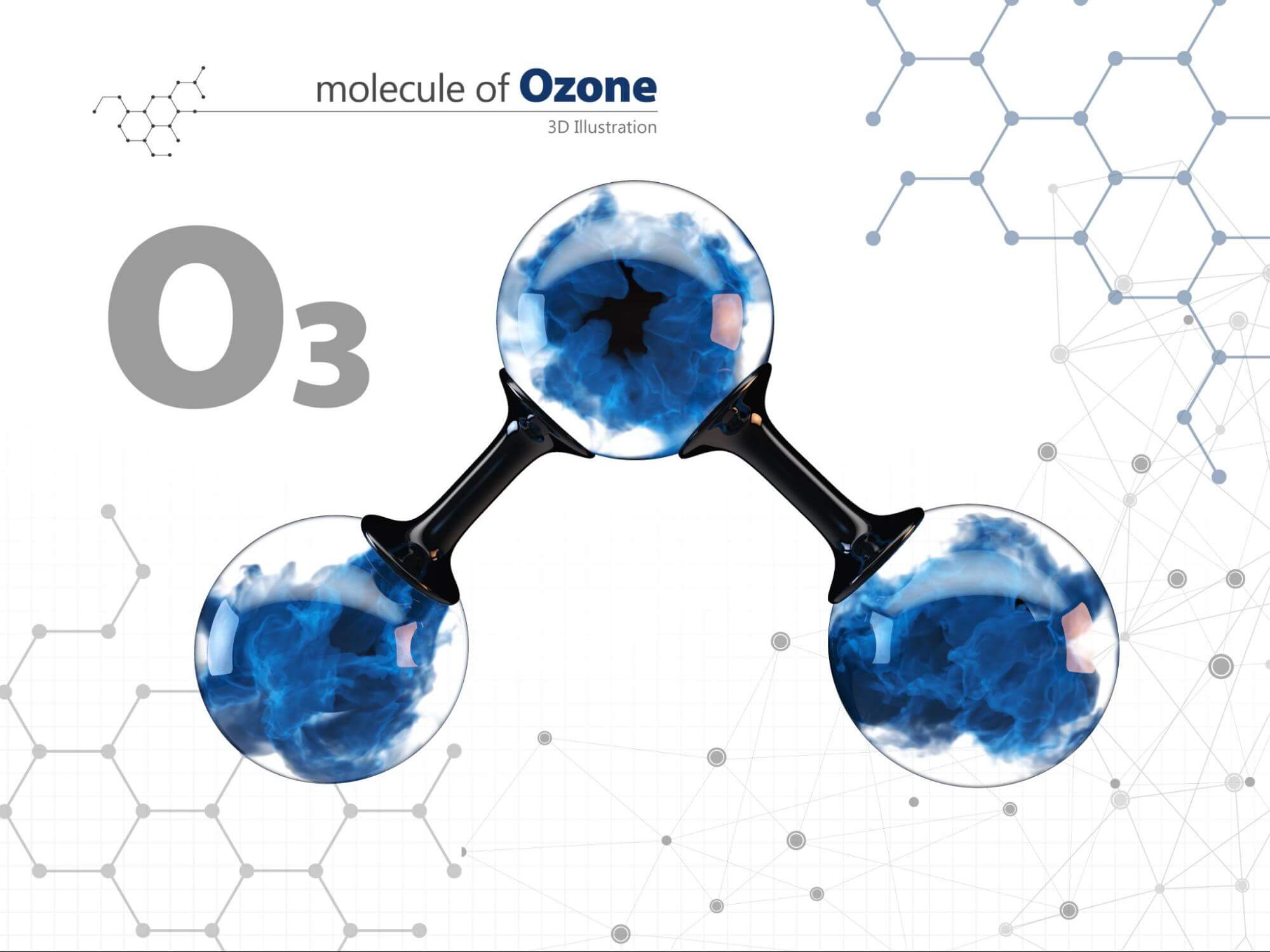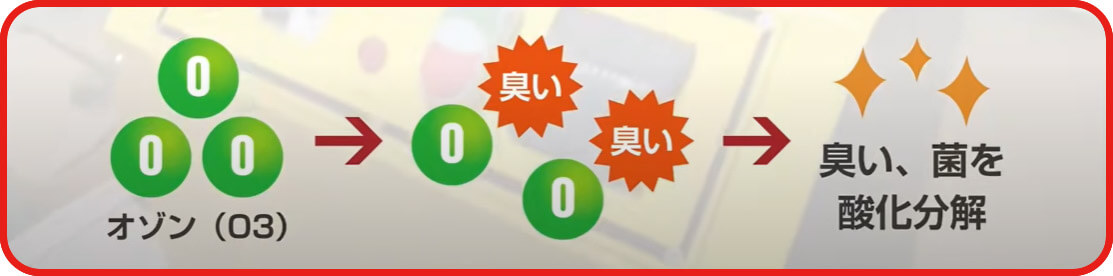 オゾンを化学式に表すと「O³」で、酸素分子「O²」にもう一つの酸素原子「O」が結びついて形成される気体です。オゾン分子「O³」の結びつきは酸素「O²」と比べるとかなり不安定であり、自然に分離して酸素「O²」に戻ろうとします。そして分離した酸素原子「O」が臭いや菌の物質と融合して酸化し、臭い物質が破壊されます。