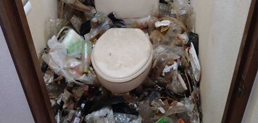 「片付けを依頼したいが、ご近所に知られたくない」とのご連絡を受け、当社にてお引き受けしました。室内は天井に届くほどの不用品の山ができており、トイレには大量のペットボトルがありました。迅速に搬出することで、お客様に感謝のお言葉をいただくことができました。