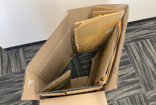 きちんとポケットに入れることで、しっかり自立したひとまとめのダンボールになります。今回は大小13枚の段ボールをまとめることができました。