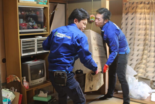 まずは段ボールや空き瓶、空き缶といった大量のゴミから片付けて運び出します。 段ボールは一つひとつ折りたたんでから搬出。量が多いため、根気のいる作業です。
